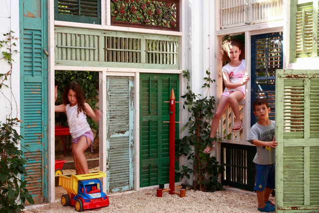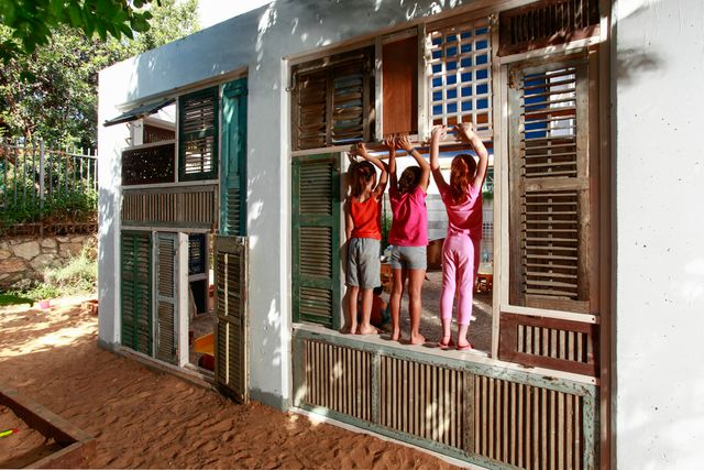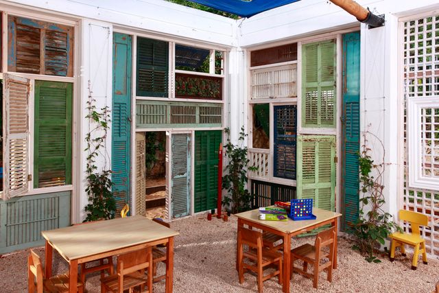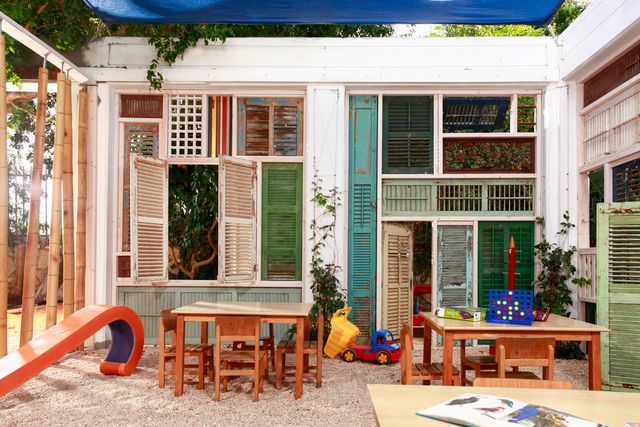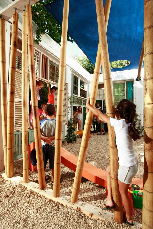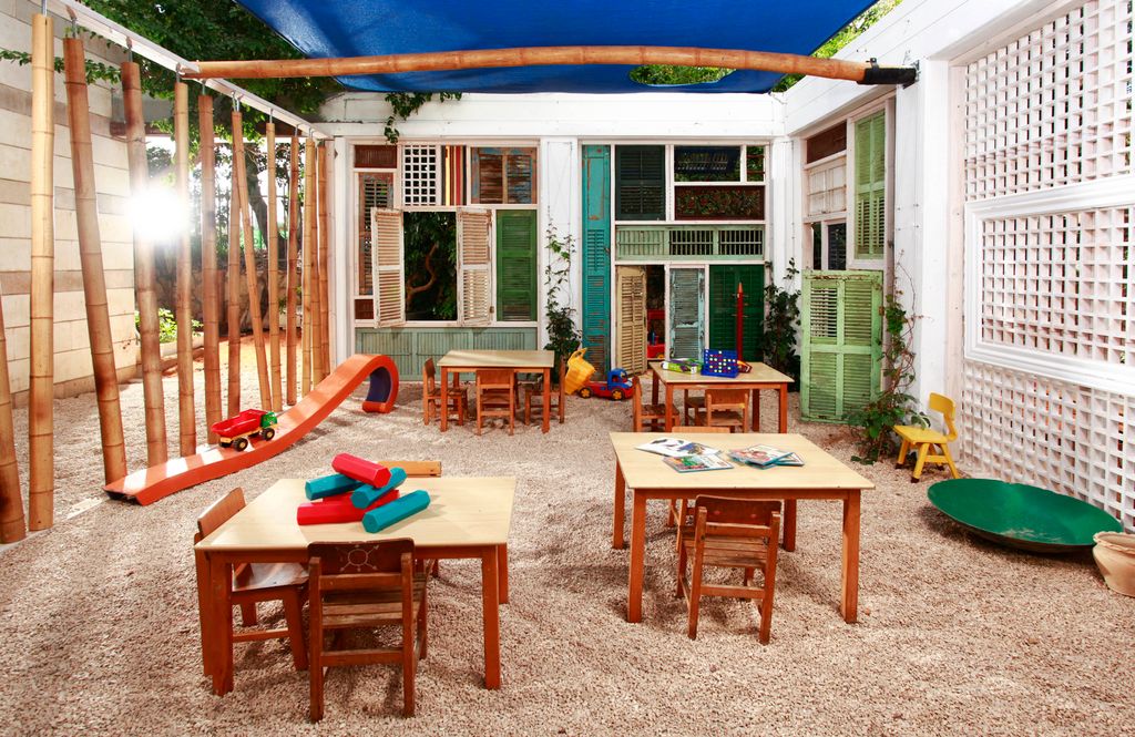 במעבר מחצר, עמודי בטון ואבנים משתלבות למרחב למידה טבעי יותר. המרחב משמש כיתת חוץ ללימודי אקולוגיה באופן משחקי המכוון לגיל הרך. המחיצות של הכיתה, נבנו ממחזור של תריסי עץ עתיקים מפירוק והם ניתנים לפתיחה וסגירה אל תוך גן הבוסתן המקיף, ובכך מעניקים גמישות ומגוון אפשרויות לתנועה ושימוש מגוון במרחב.